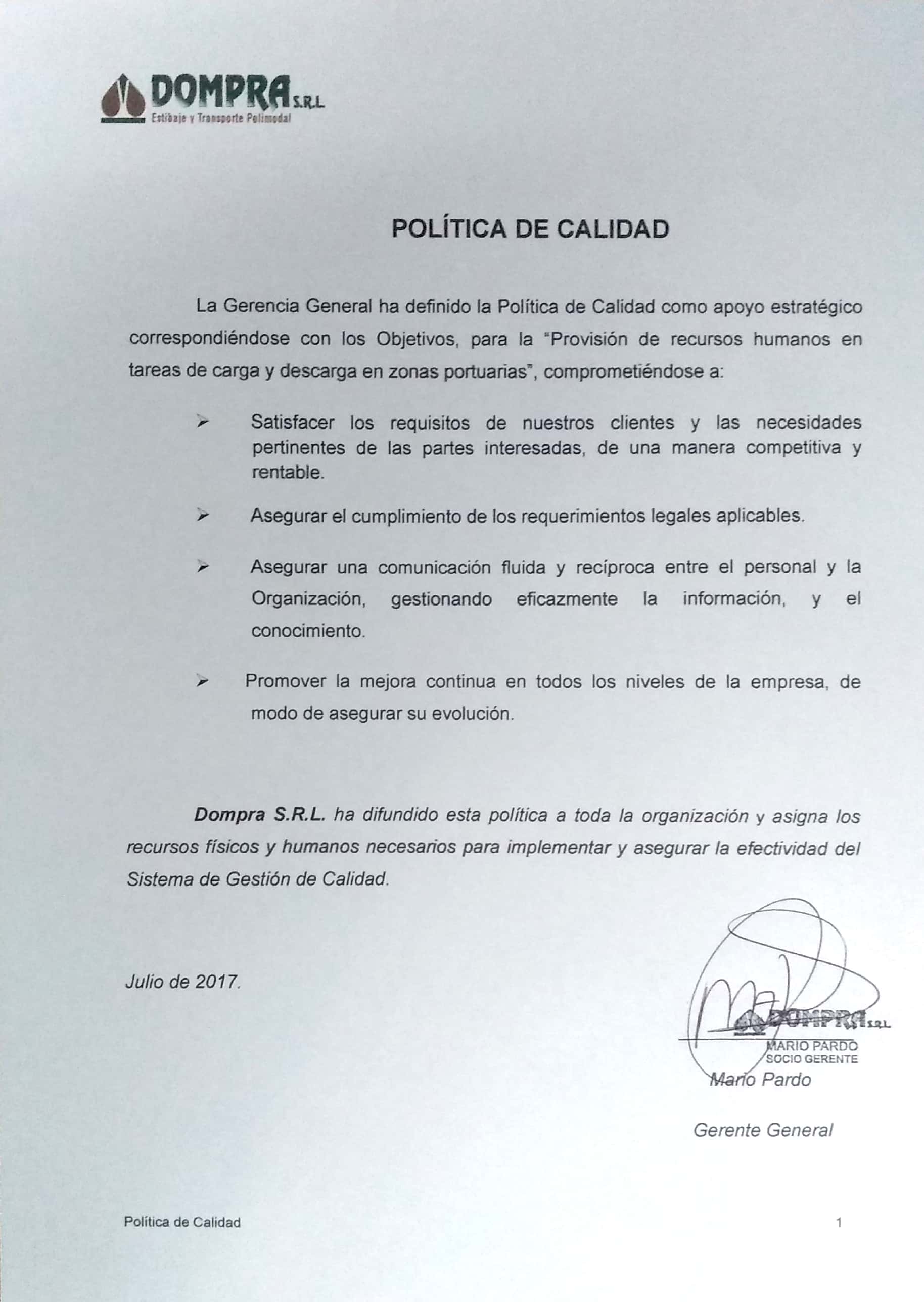 DOMPRA S.R.L. es una empresa dirigida por el Sr. Mario Pardo, quien tras haber transitado por diversas cooperativas y empresas del sector, comienza, en el año 1996 a desarrollar la actividad de la empresa en la Terminal 4 del Puerto de Buenos Aires de forma ininterrumpida. Desde entonces, DOMPRA S.R.L. ha logrado convertirse en una empresa líder en Servicios Portuarios, operando además, los puerto de Lima, La Plata, Ibicuy (Provincia Entre Rios) y diversas plazoleta fiscales de la Ciudad de Buenos Aires. En la actualidad, la empresa cuenta con 2 virtudes fundamentales que garantizan la calidad y eficiencia del servicio brindado:
